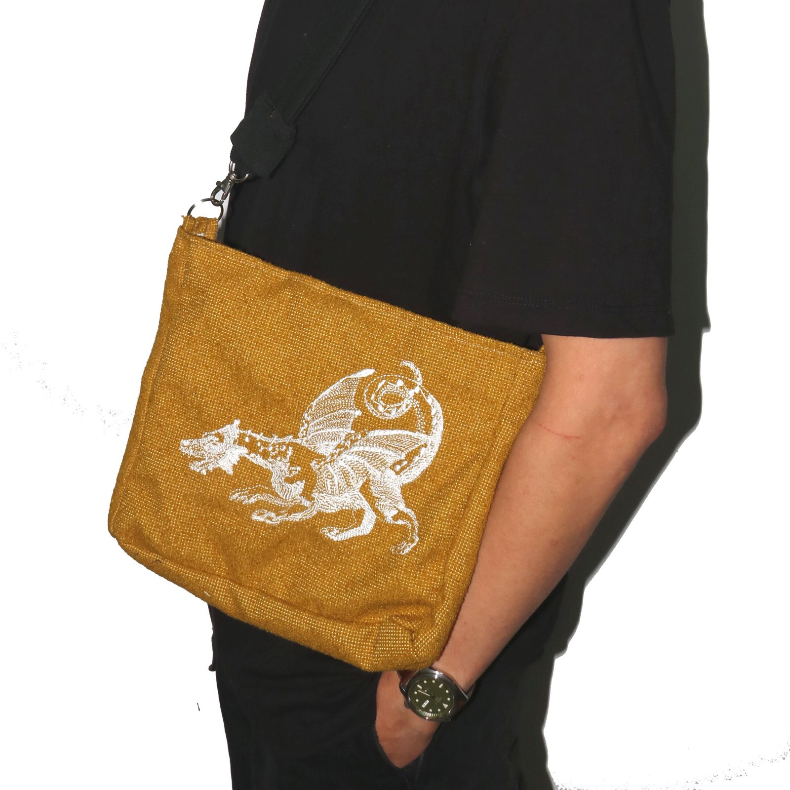 Solo existe un bolso  en esta tela. Aunque el bordado del dragón medieval podrá aparecer en otras versiones, cada una se elaborará con telas distintas —algunas únicas y otras provenientes de colecciones más amplias—. Esta versión no se volverá a producir, ya que el retazo de tela disponible alcanzó únicamente para esta pieza.
