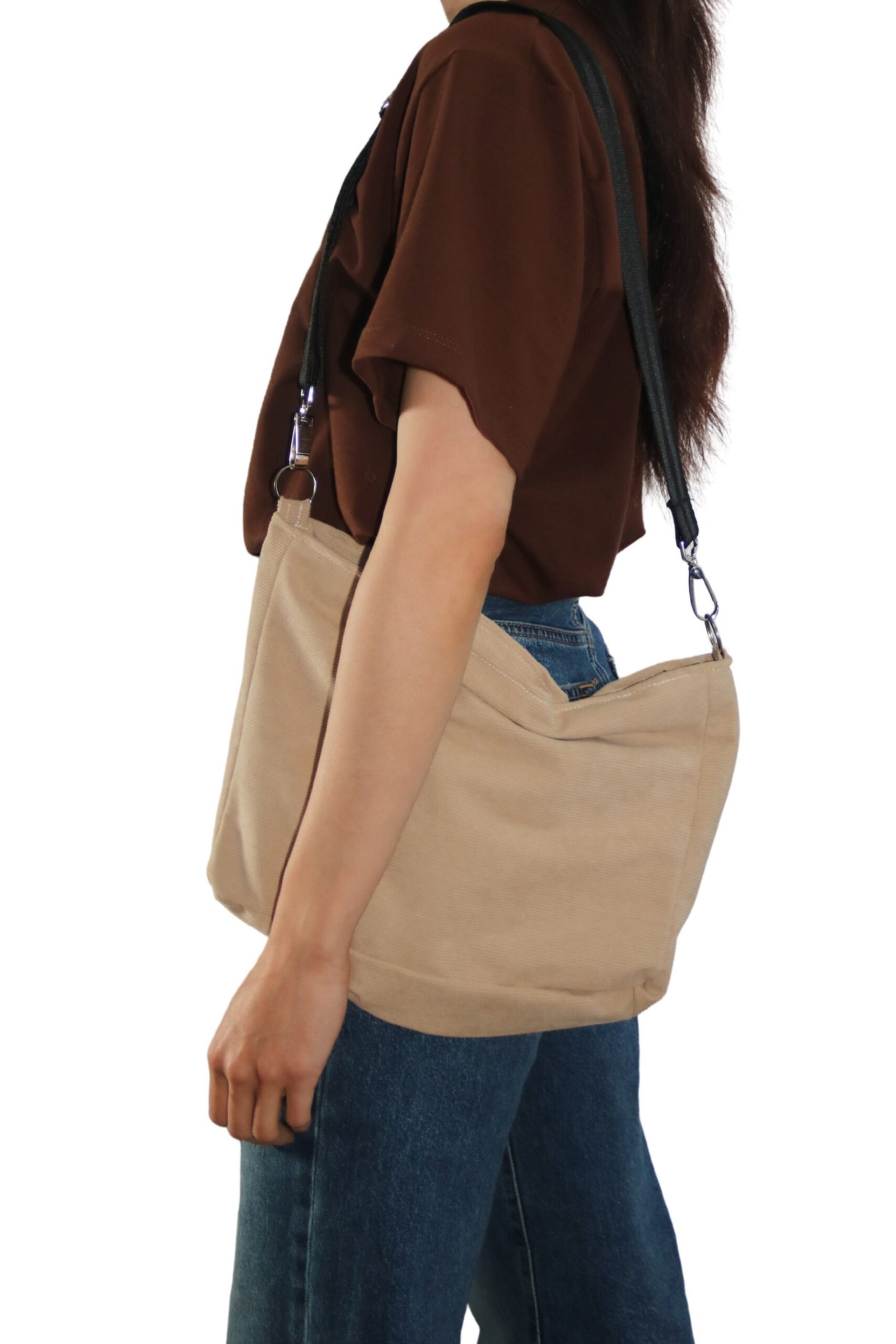 El bolso está confeccionado en tela de pana, un material cómodo, suave al tacto y elegante, que aporta carácter y versatilidad. Su textura lo convierte en una pieza fácil de integrar tanto a looks cotidianos como a contextos más formales, sin perder funcionalidad.