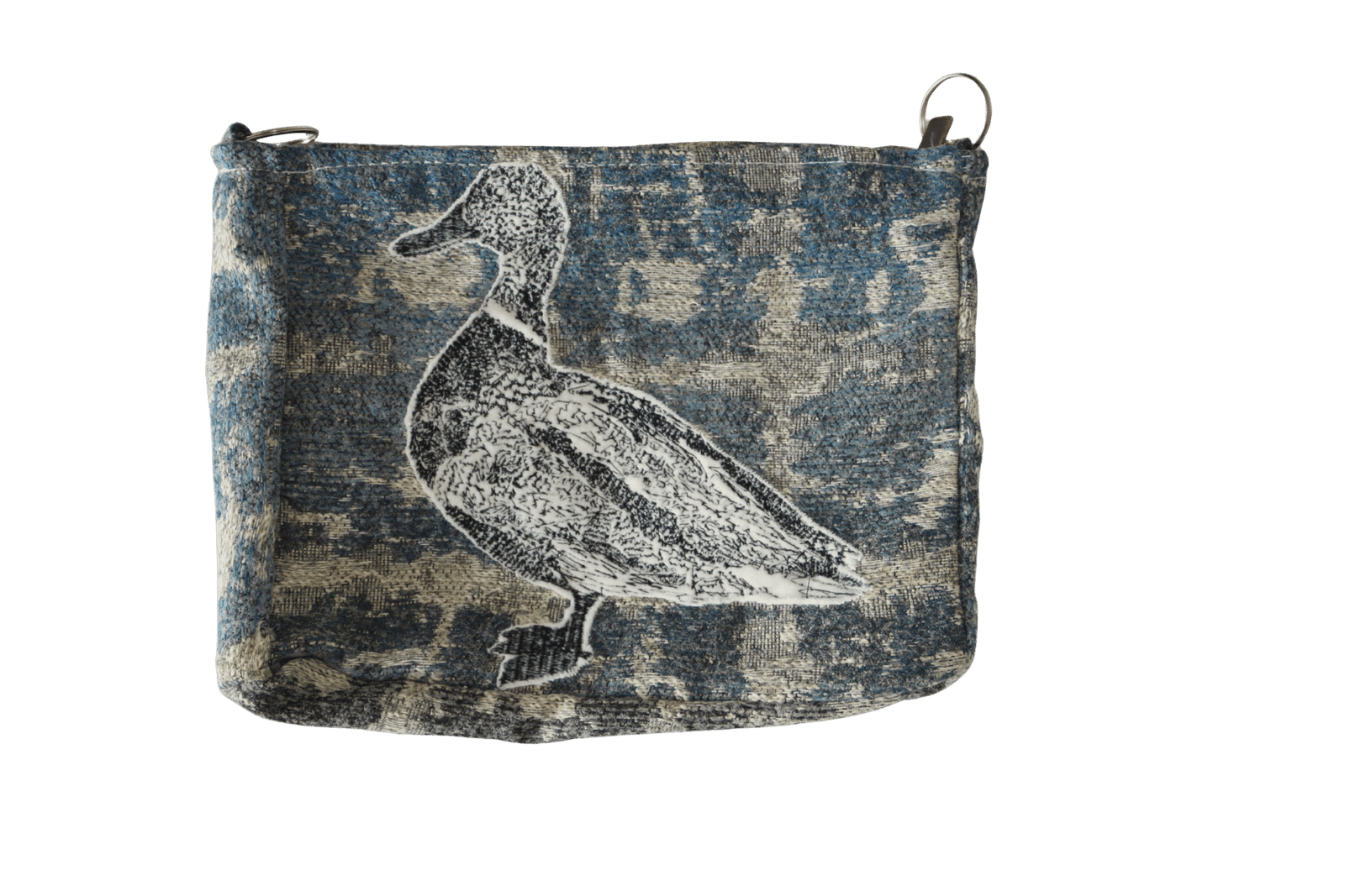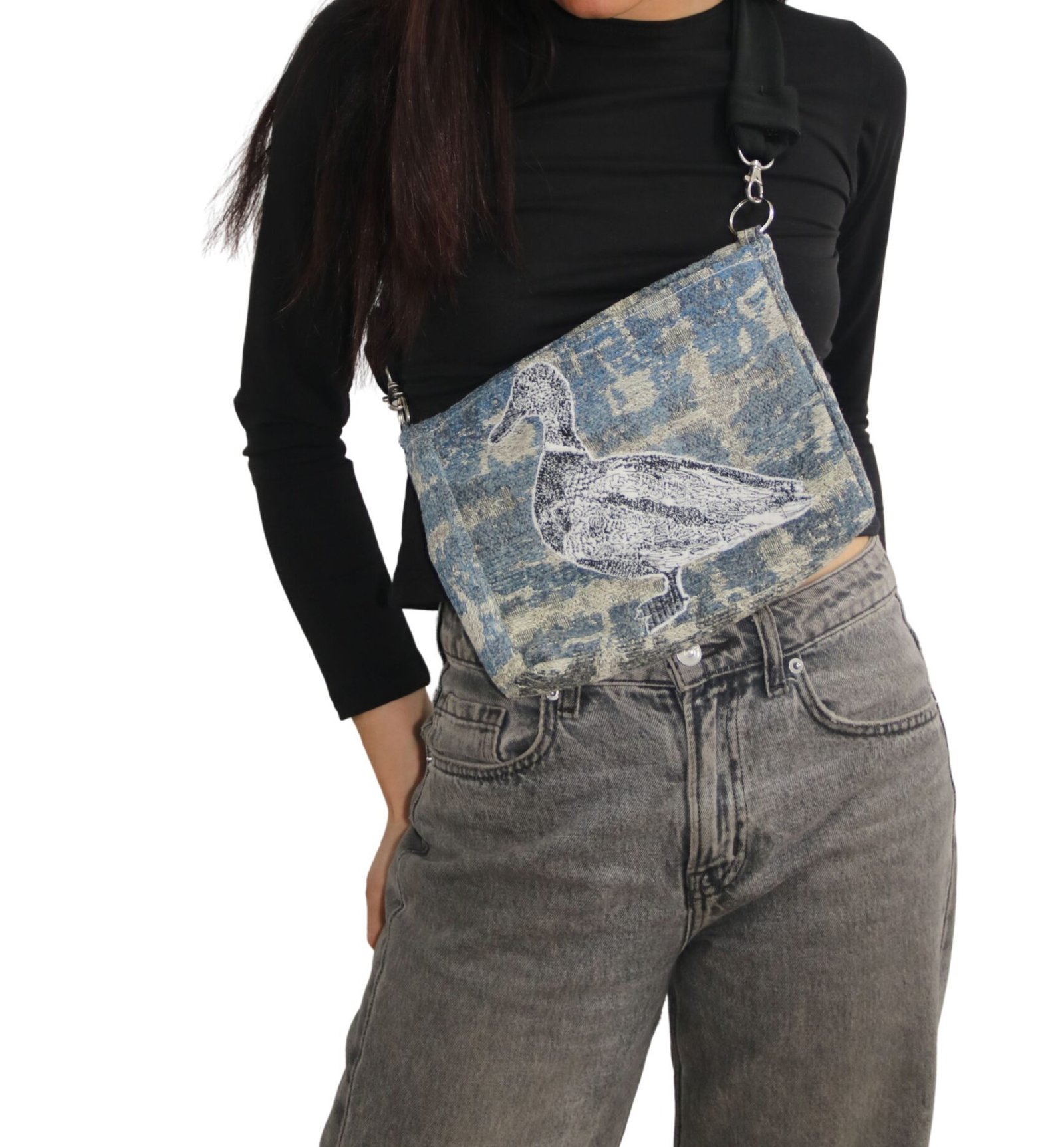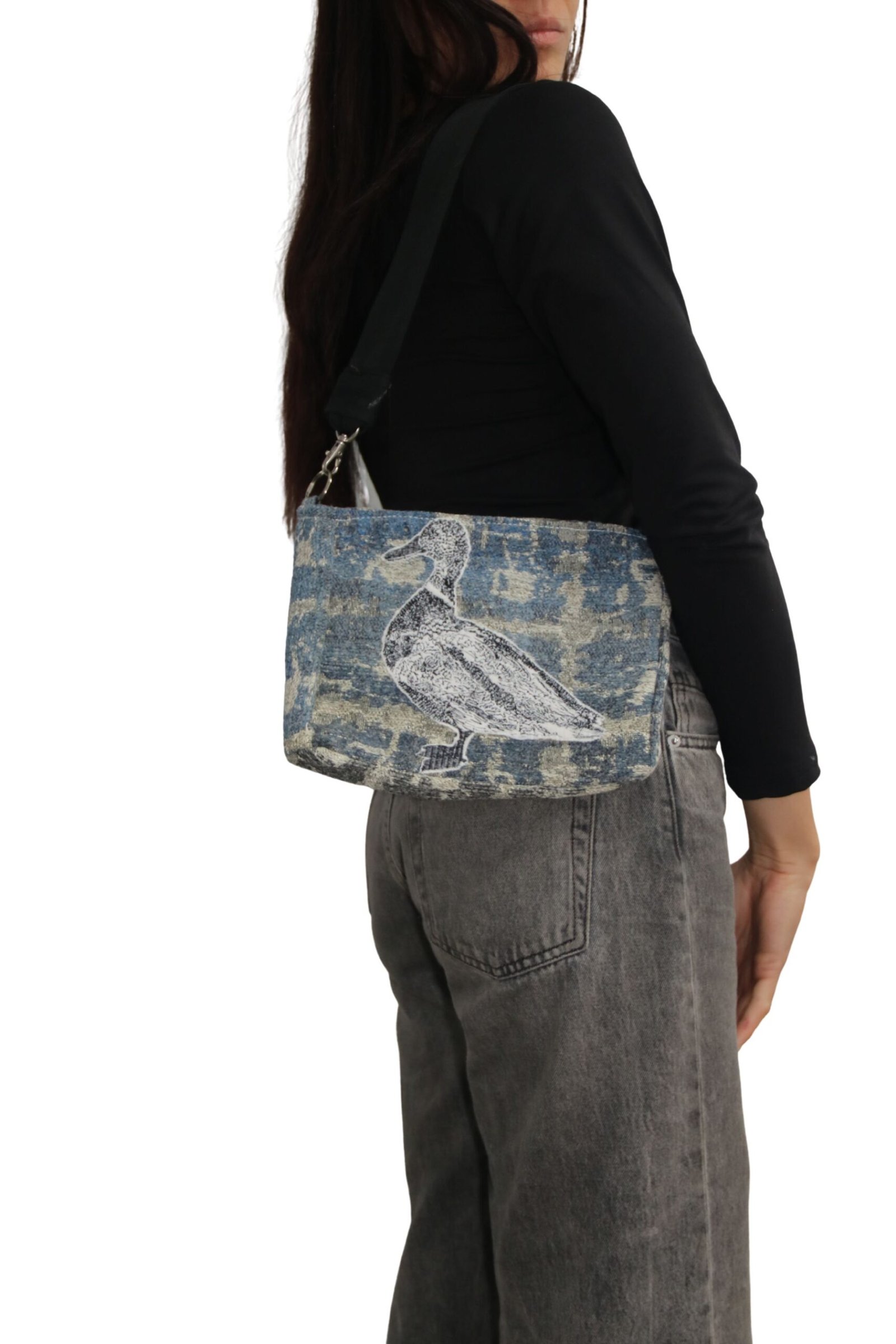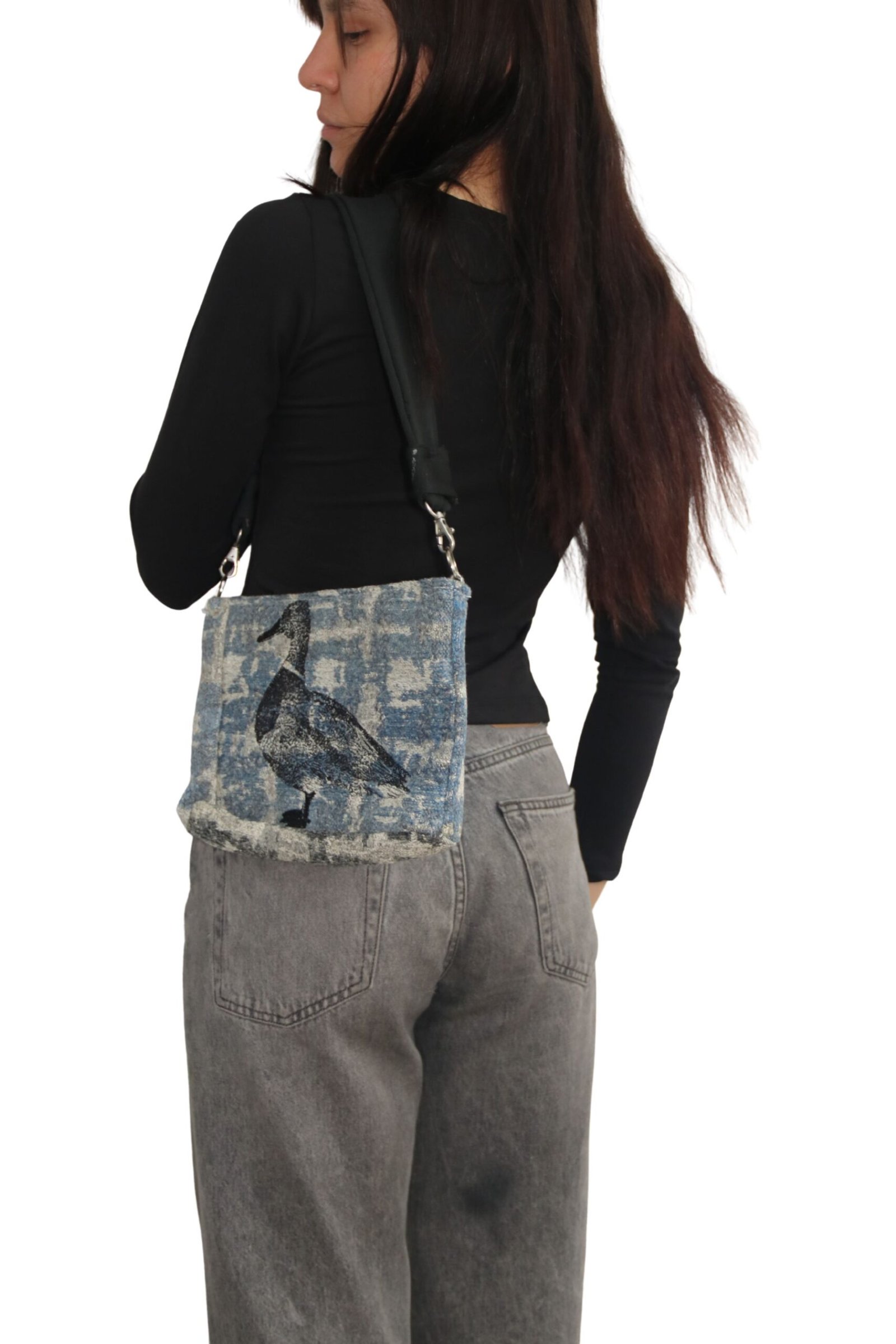 Este bolso es irrepetible. Aunque el bordado del pato podrá aparecer en otras versiones, cada una se elaborará con telas distintas —algunas únicas y otras provenientes de colecciones más amplias—. Esta versión no se volverá a producir, ya que el retazo de tela disponible alcanzó únicamente para esta pieza.