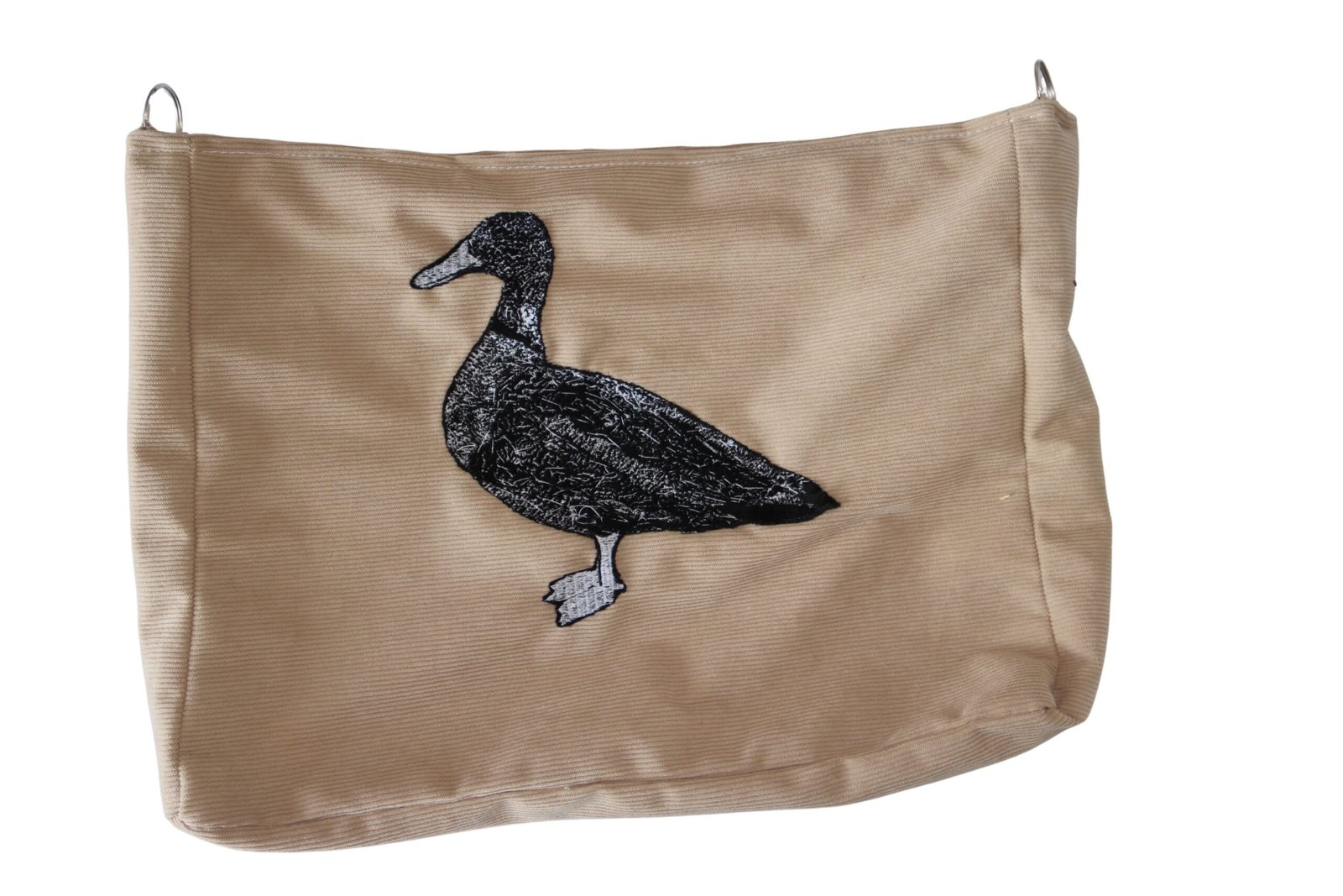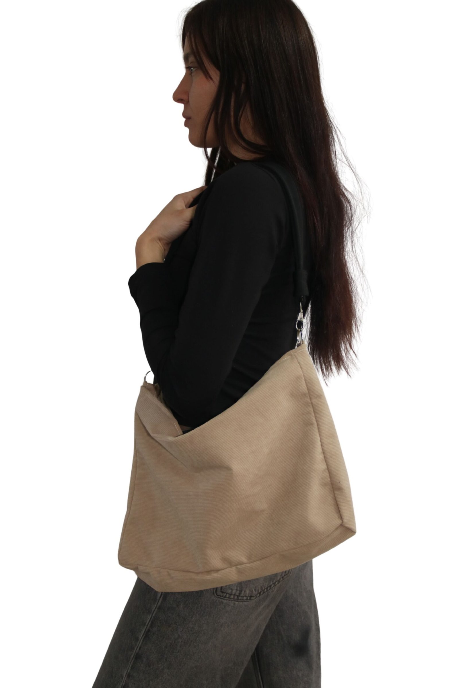 Este bolso esta hecho en tela de pana y tiene interior impermeable