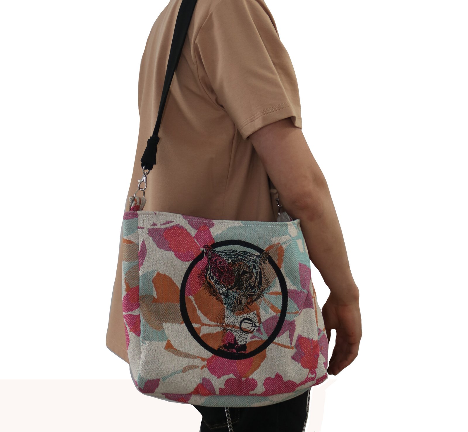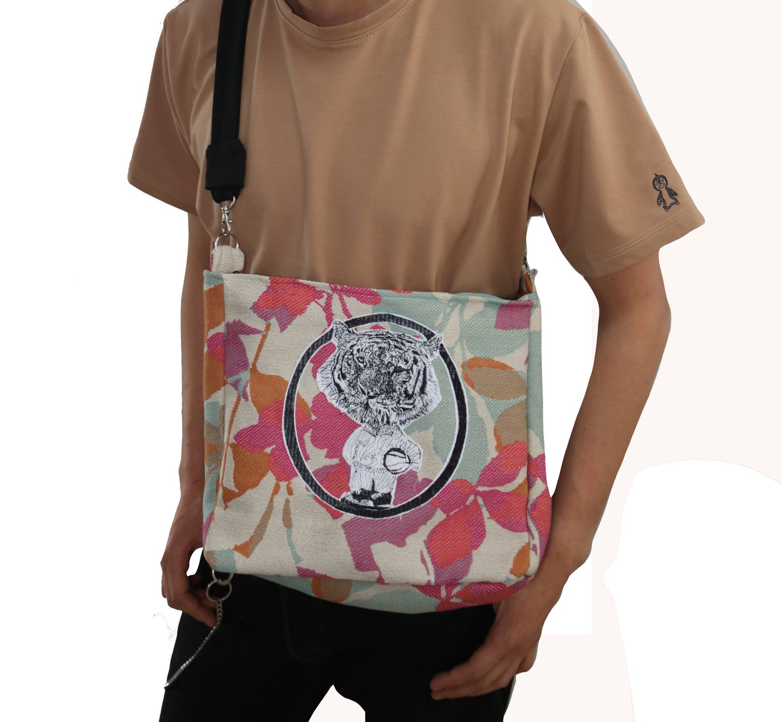 Solo existe un bolso con este diseño en esta tela. Aunque el bordado del  tigre basketbolero podrá aparecer en otras versiones, cada una se elaborará con telas distintas —algunas también únicas, otras en formatos de tela de la colección (telas que se repiten)—. Esta versión no se volverá a producir debido a que solo contamos  con el retazo  de este bolso.